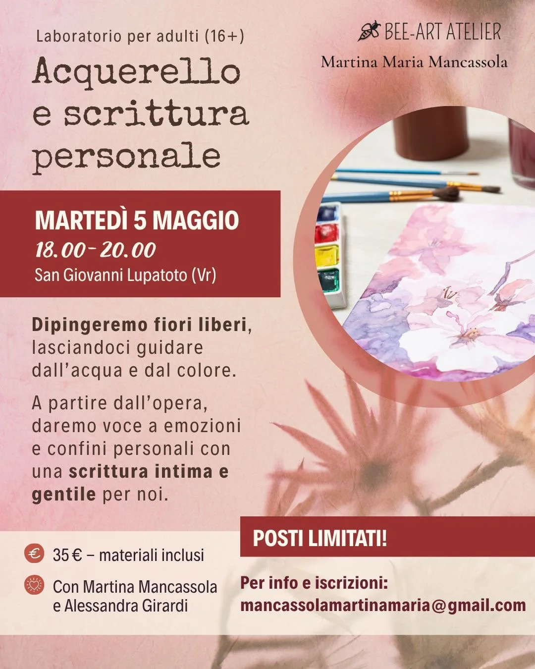 Un laboratorio creativo vicino Verona (San Giovanni Lupatoto) per prendersi un tempo lento tra acqua, colori e parole. Dipingeremo fiori liberi ad acquerello e poi passeremo a una scrittura personale guidata: un modo semplice e concreto per esplorare i nostri confini e imparare a descriverci con più gentilezza.